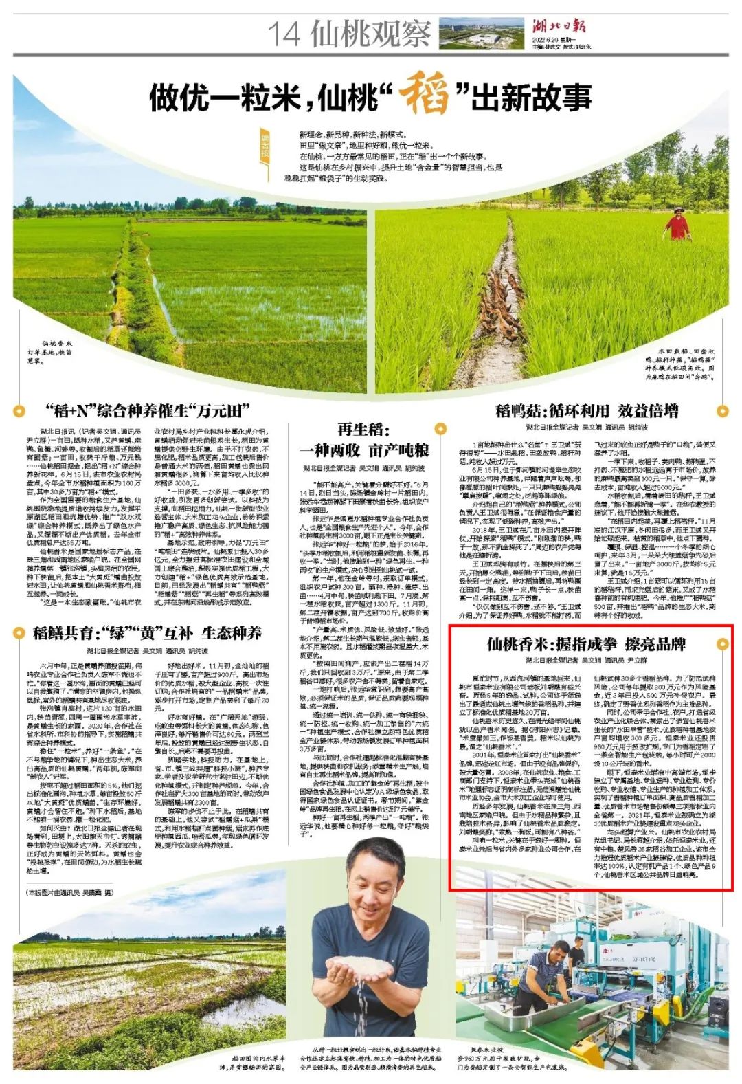 《湖北日报》6月20日以“做优一粒米,仙桃‘稻’出新故事”报道仙桃市恒泰米业历经5年的选品、试种,终于筛选出了最适应仙桃土壤气候的香稻品种,并建立了标准化优质稻基地30万亩。